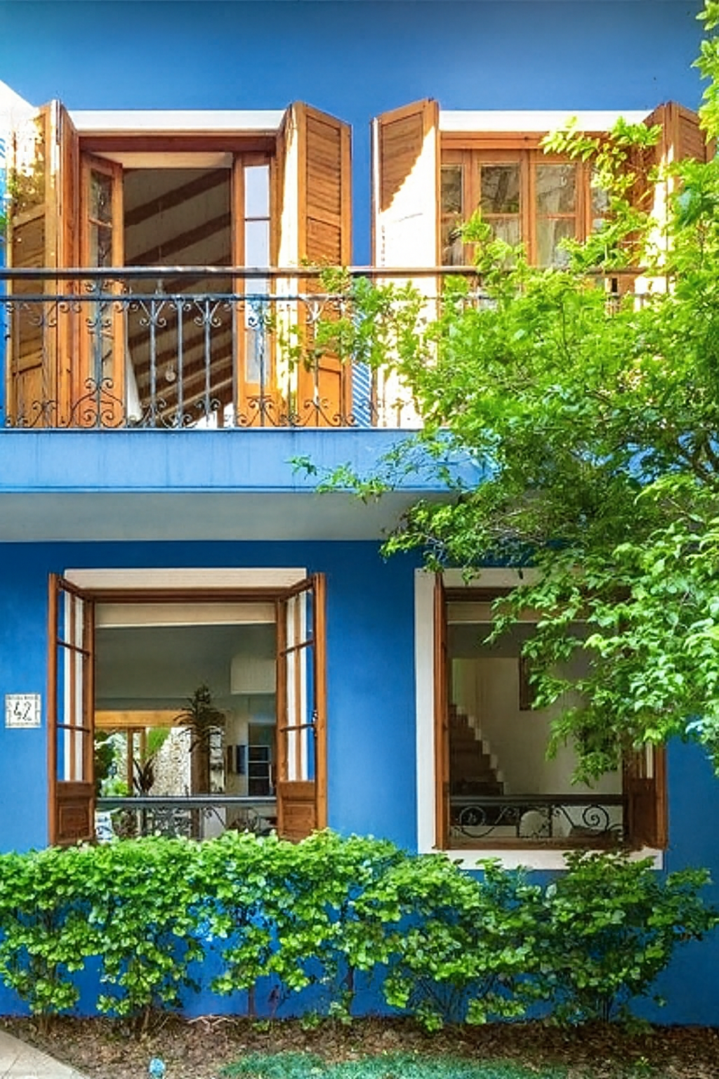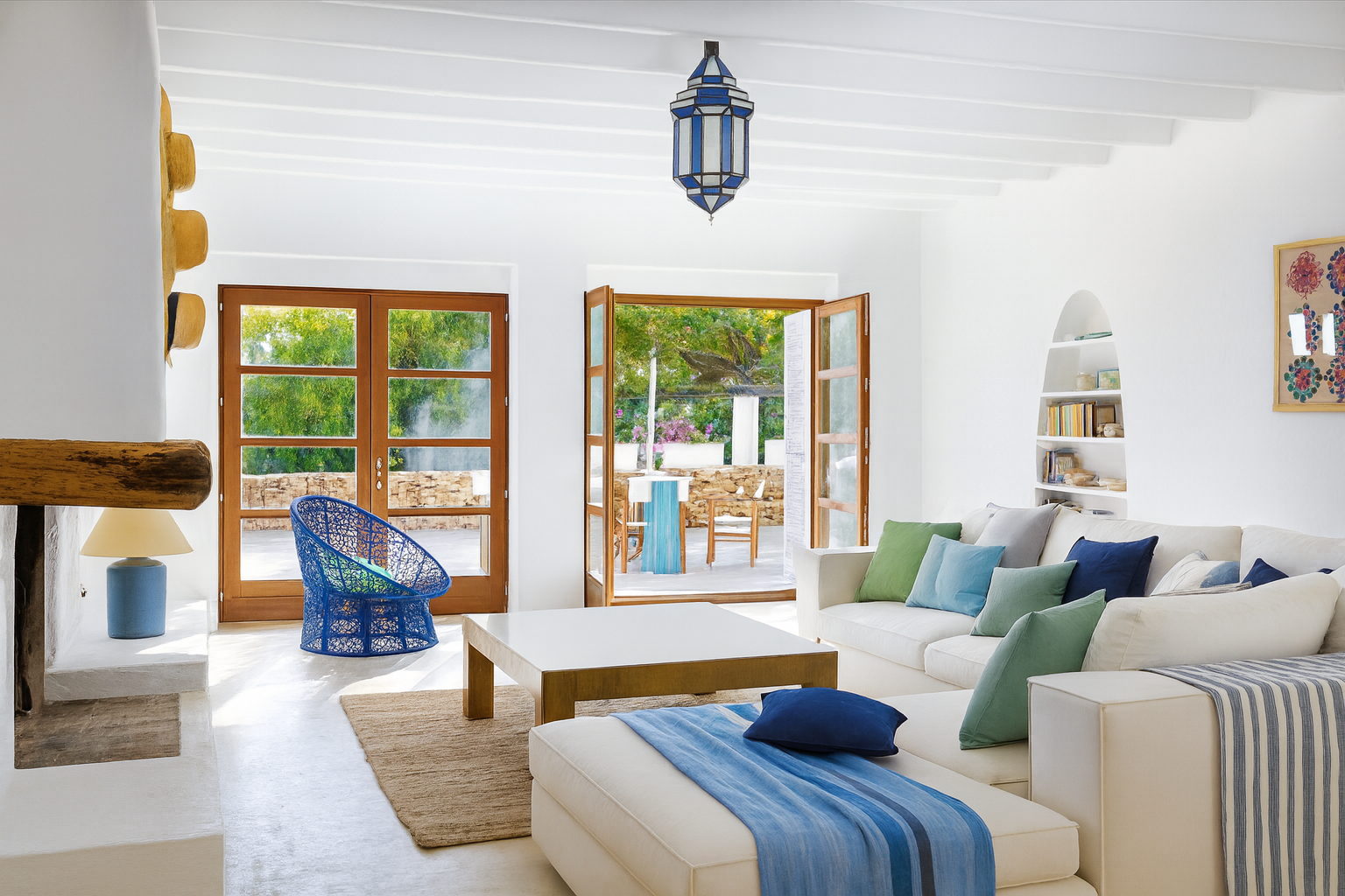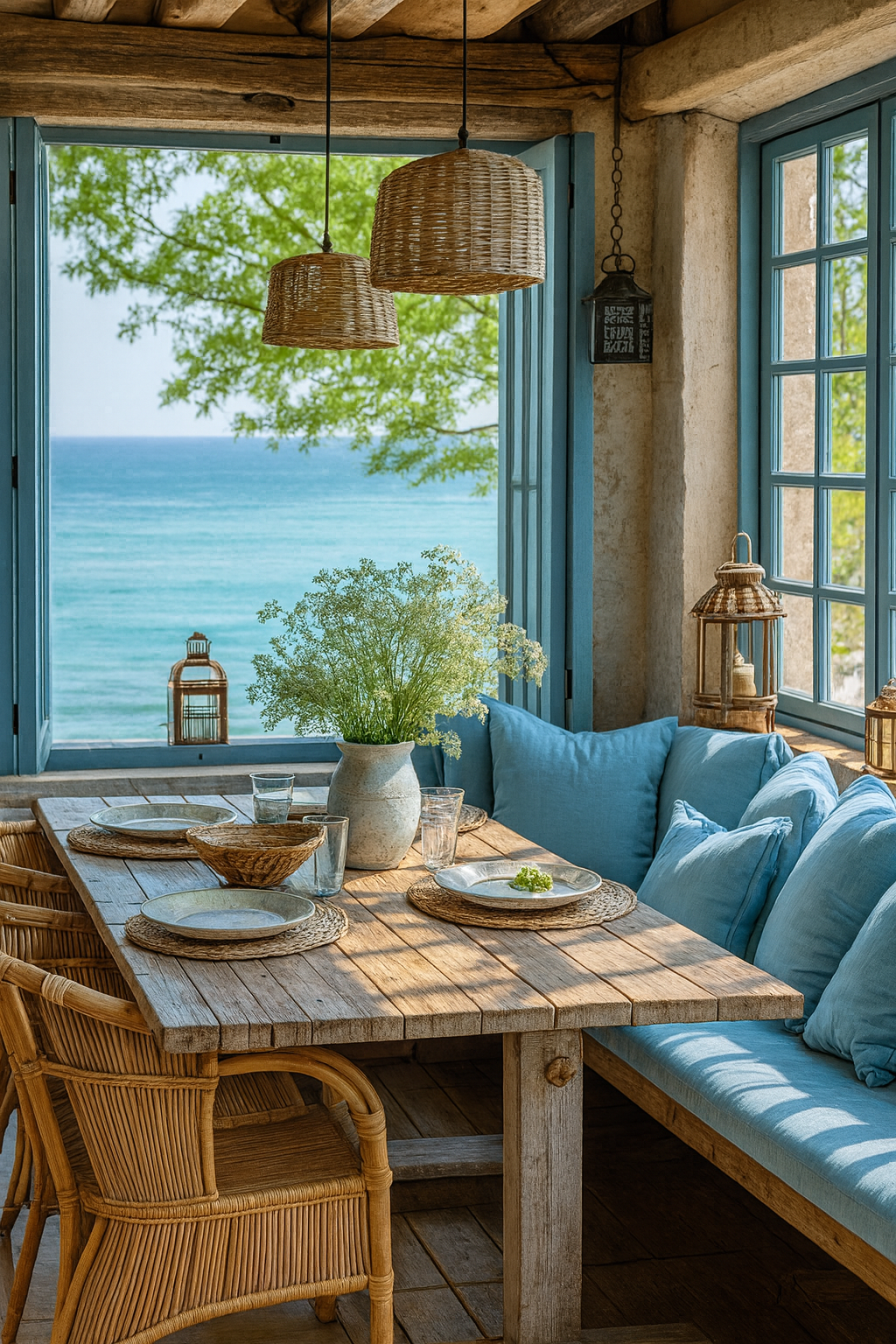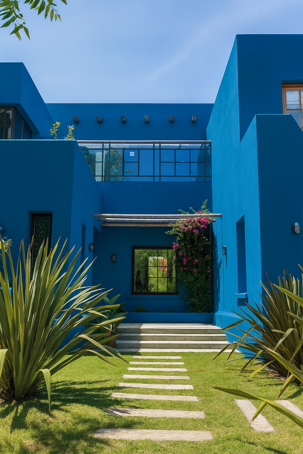 Los tonos azules evocan serenidad y frescura, mientras los blancos, la madera y la piedra aportan calidez y textura. El diseño prioriza la luz natural y la integración entre los espacios interiores y exteriores, generando continuidad visual hacia el paisaje.