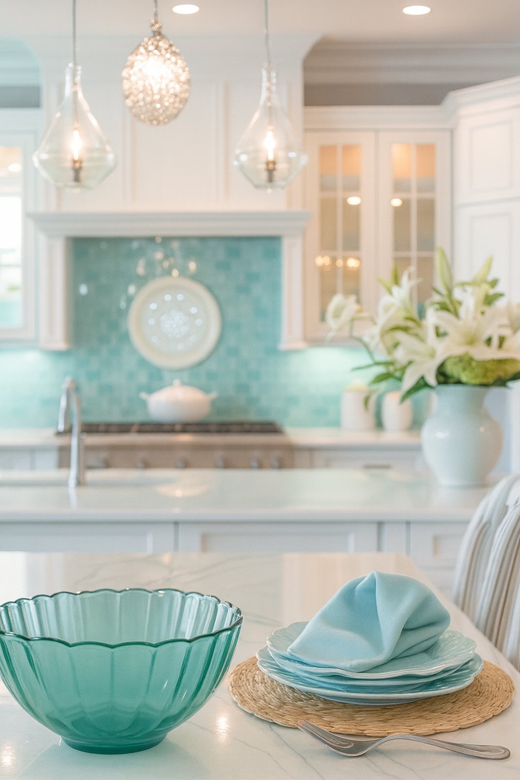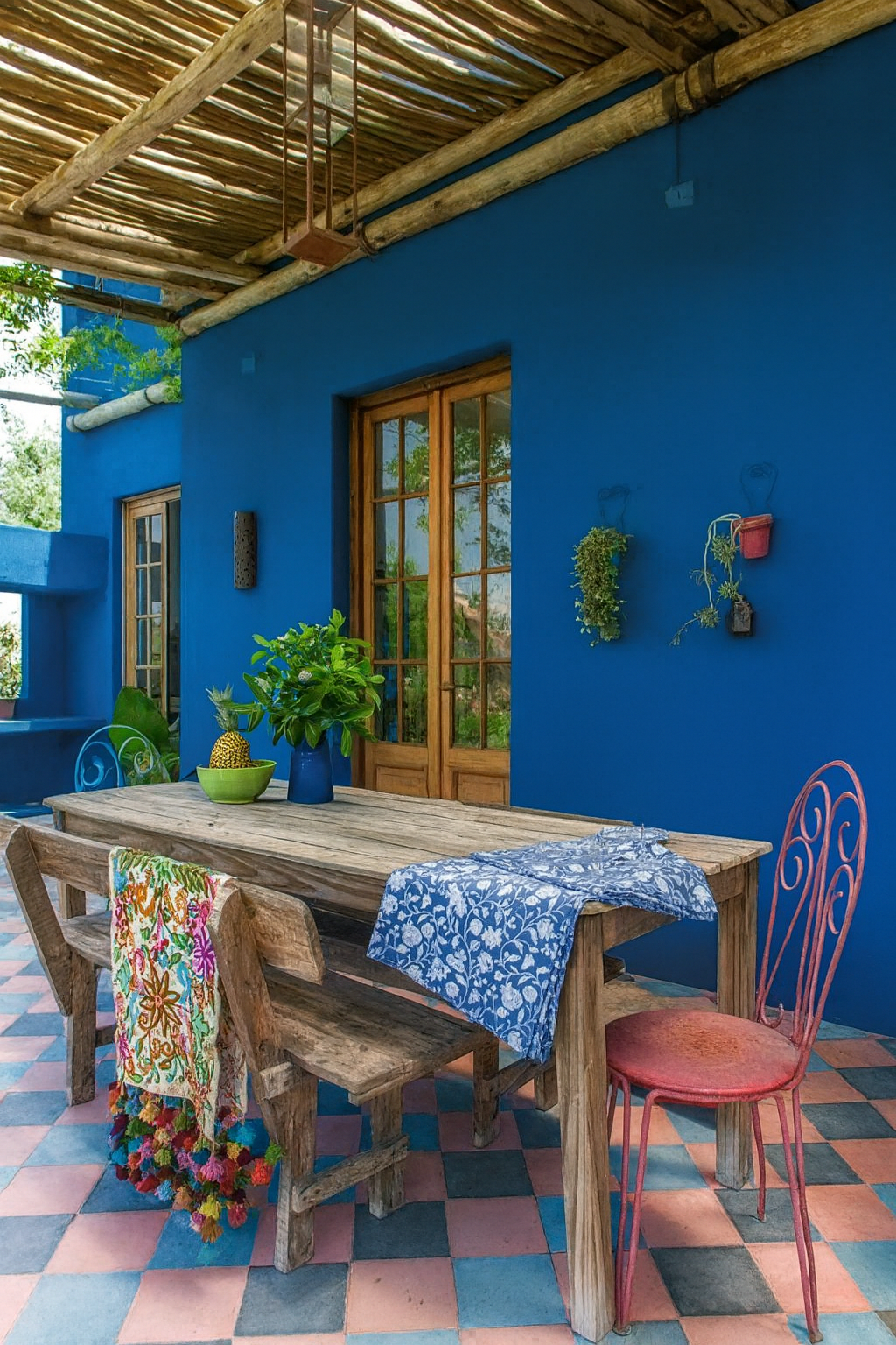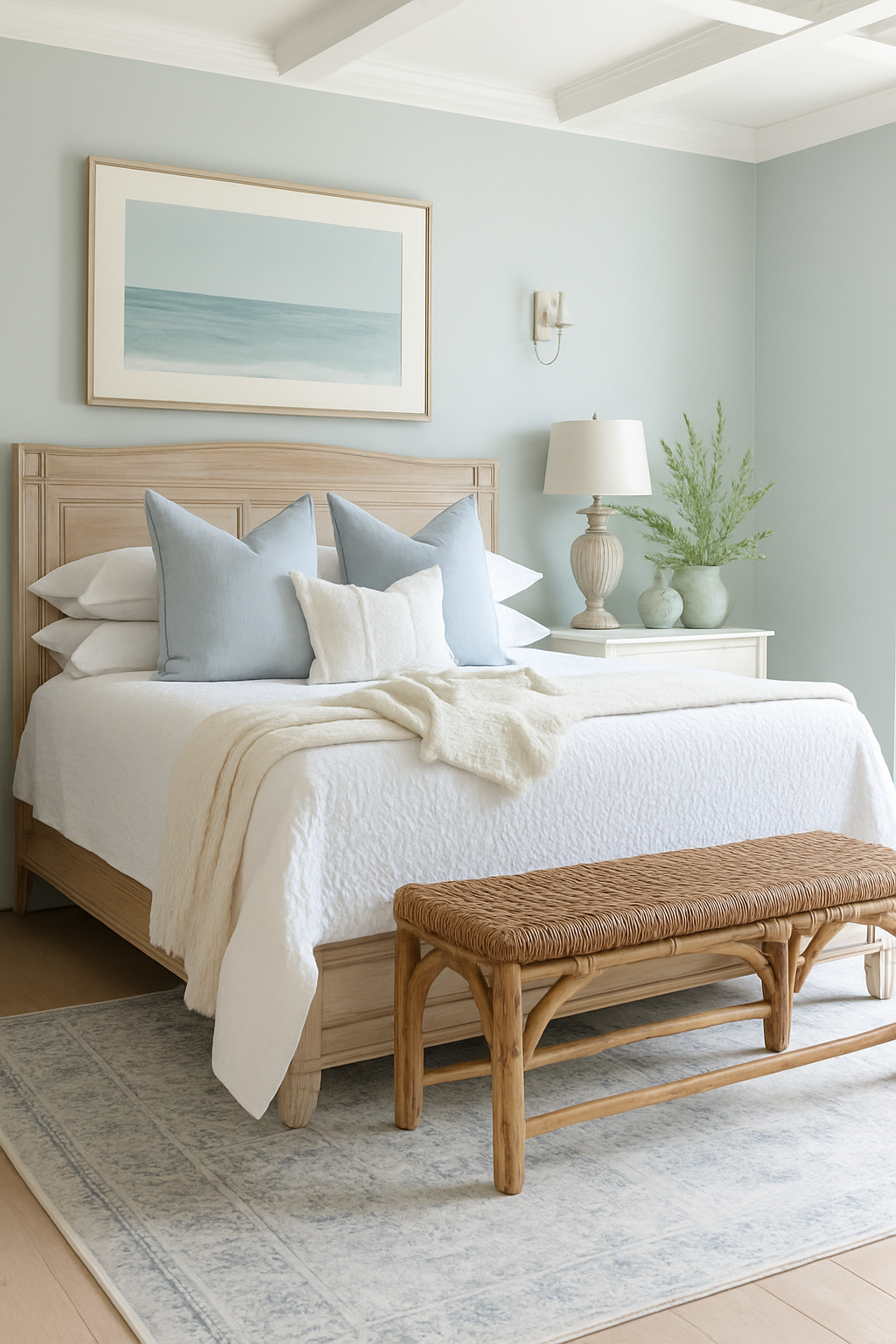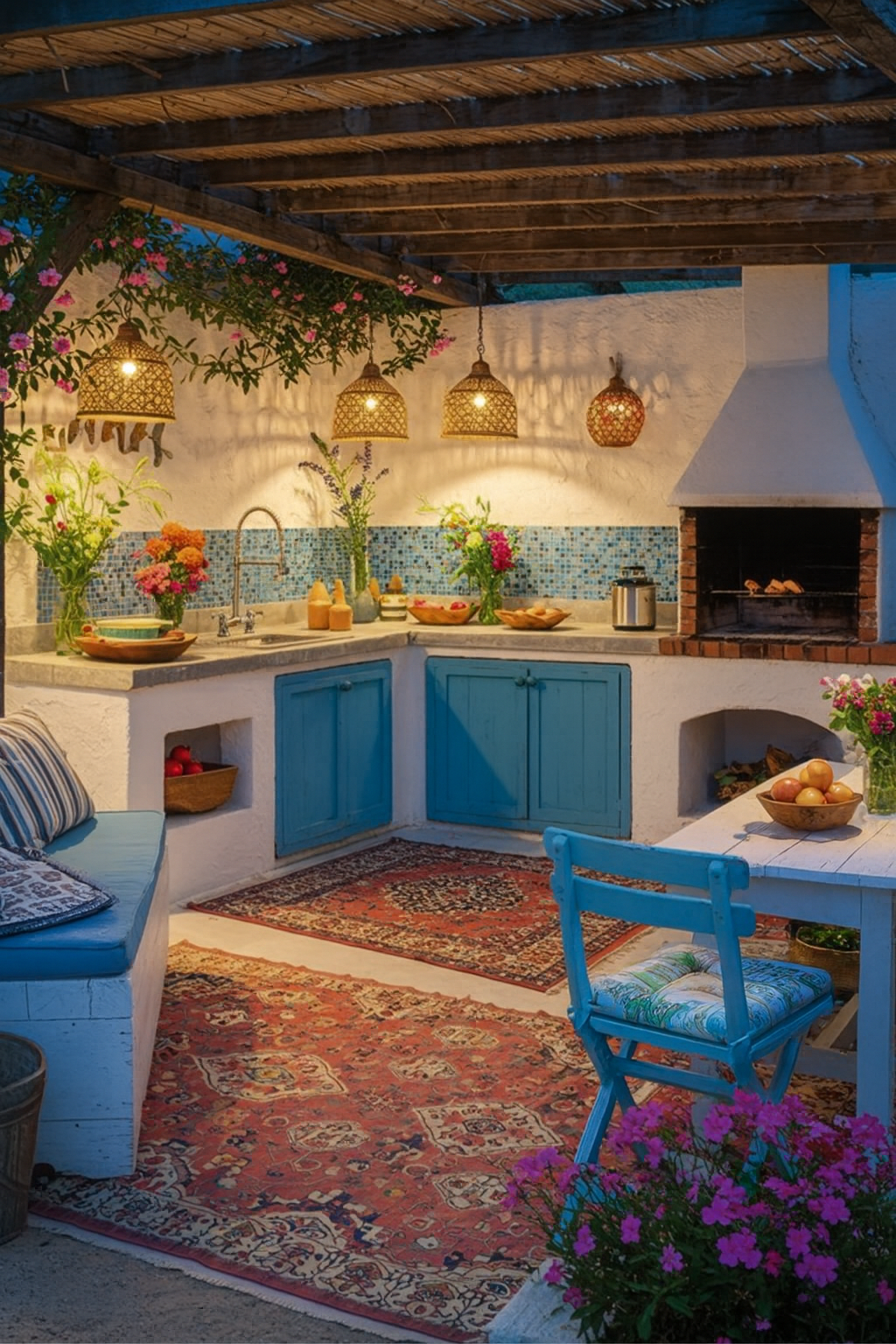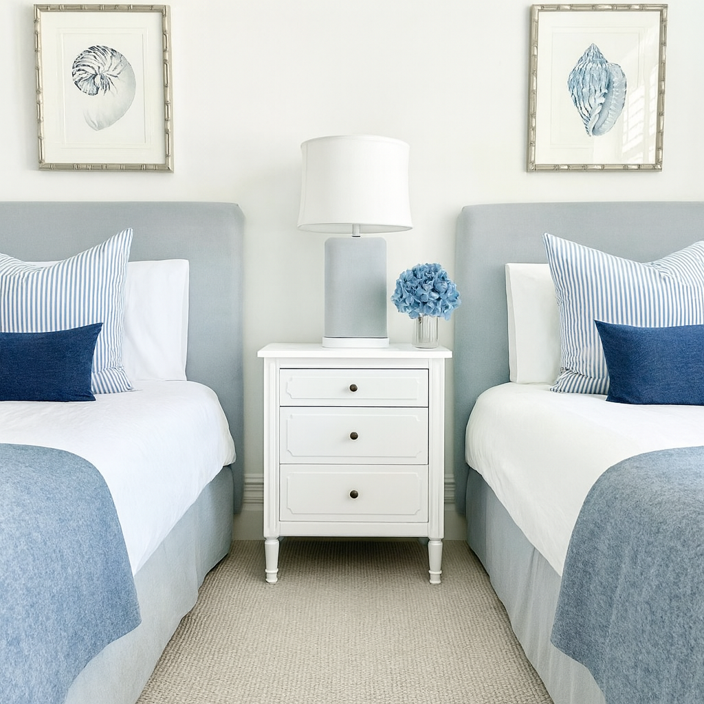Los tonos azules evocan serenidad y frescura, mientras los blancos, la madera y la piedra aportan calidez y textura. El diseño prioriza la luz natural y la integración entre los espacios interiores y exteriores, generando continuidad visual hacia el paisaje.